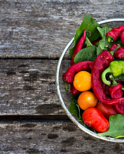 Свежие овощи - шпинат, помидоры, острый перец, чеснок