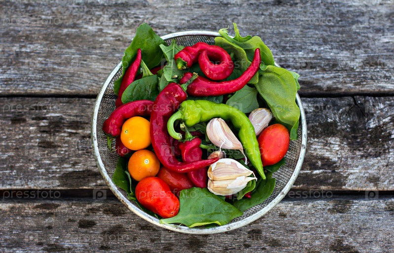 Свежие овощи - шпинат, помидоры, острый перец, чеснок