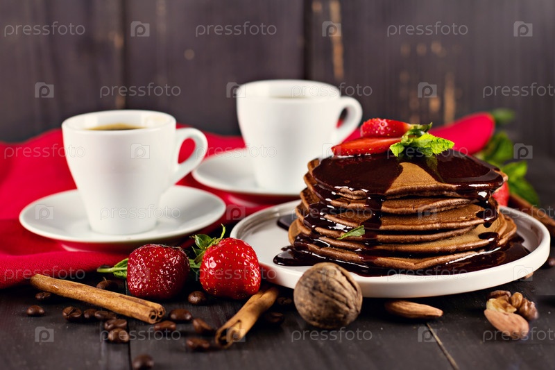Шоколадные блины с шоколадным соусом и клубникой