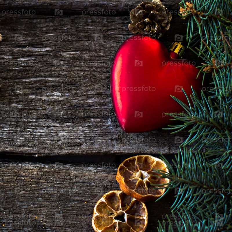 Новогодняя композиция. Еловые ветви и рождественские украшения на фоне деревянных досок