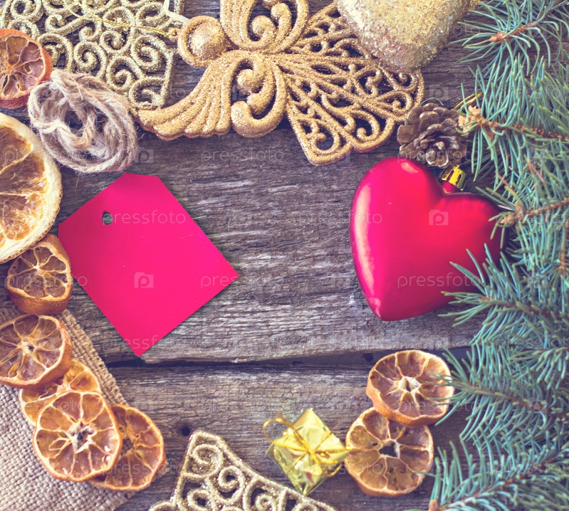 Новогодняя композиция. Еловые ветви и рождественские украшения на фоне деревянных досок