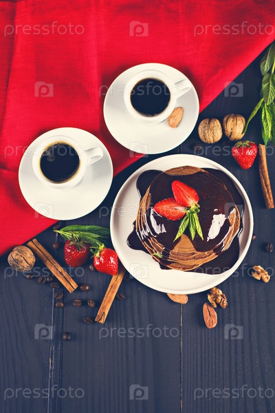 Шоколадные блины с шоколадным соусом и клубникой