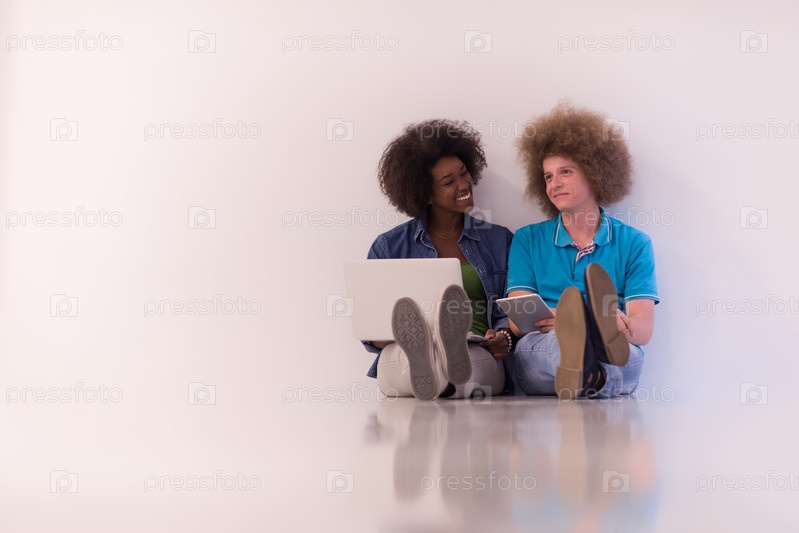 Многонациональная пара сидит на полу с ноутбуком и планшетом