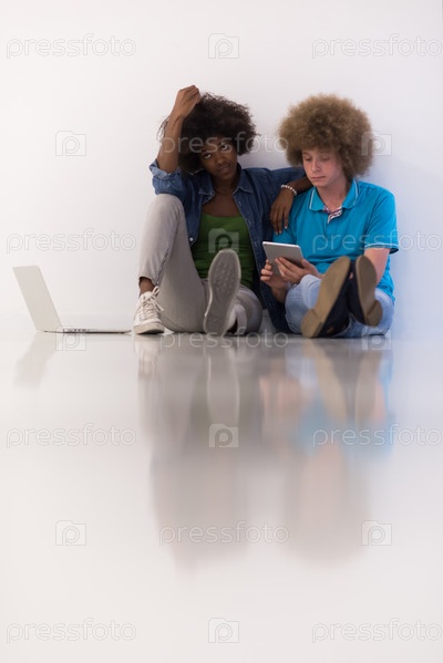 Многонациональная пара сидит на полу с ноутбуком и планшетом