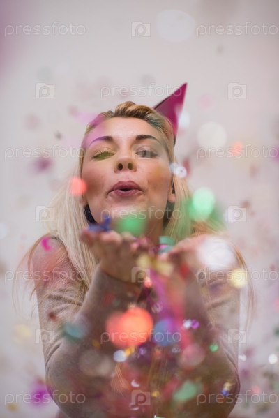 Женщина дует конфетти в воздух