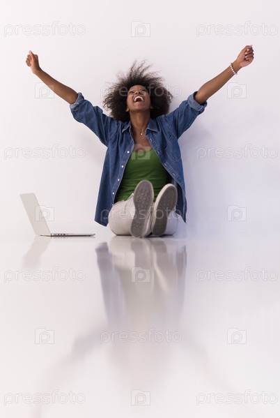 Афро-американская женщина, сидя на полу с ноутбуком