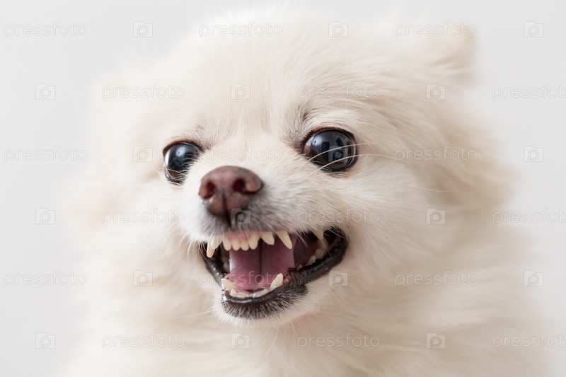 Белый шпиц на белом фоне