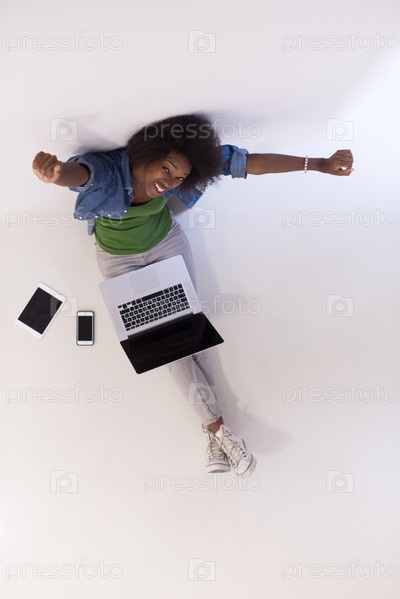 Афро-американская женщина, сидя на полу с ноутбуком