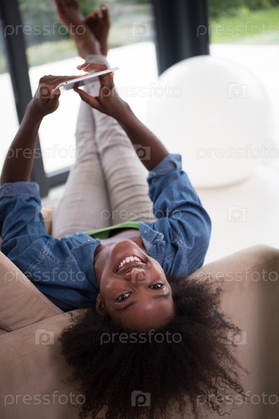 Афро-американская женщина в доме с цифровым планшетом