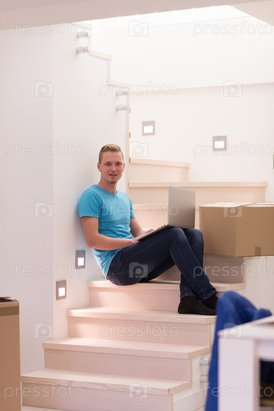 Молодой человек, сидящий в лестнице дома
