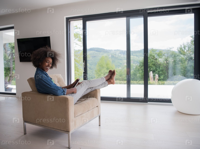 Афро-американская женщина в доме с цифровым планшетом