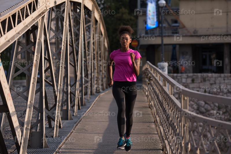Афро-американская женщина бежит по мосту