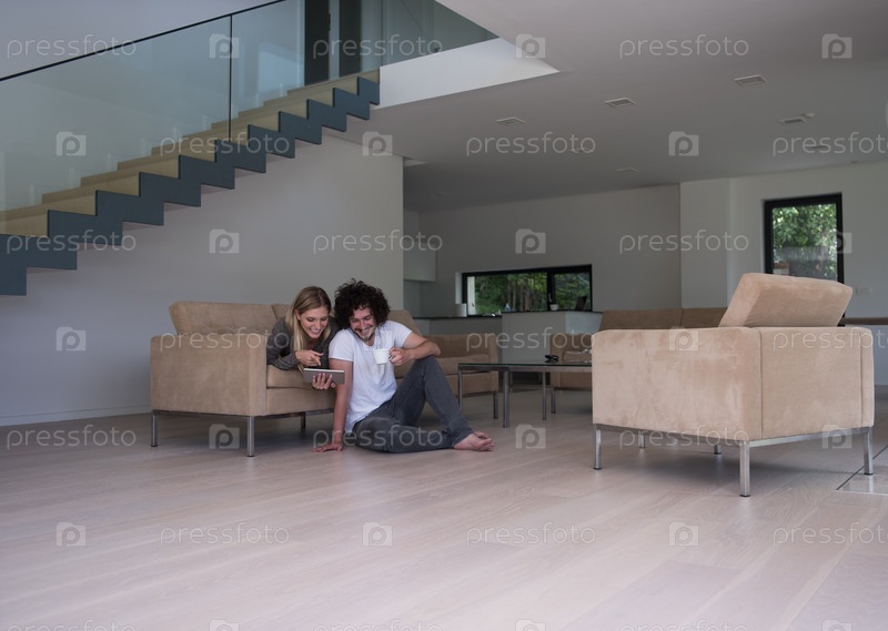 Пара отдыхает дом с планшетными компьютерами