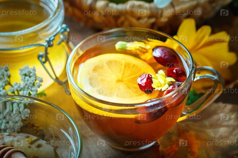 Вкусный свежий мед и чашка здорового чая с лимоном и шиповником