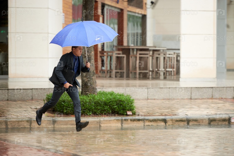 Азиатский бизнесмен бегает в дождь