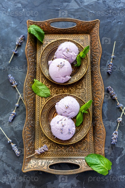 Домашнее мороженое лавановое на бронзовой подносе