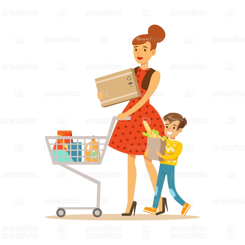 Мать и сын с тележкой покупок