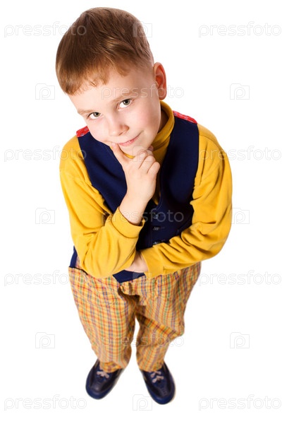 Задумчивый мальчик смотрит вверх, изолировано на белом фоне