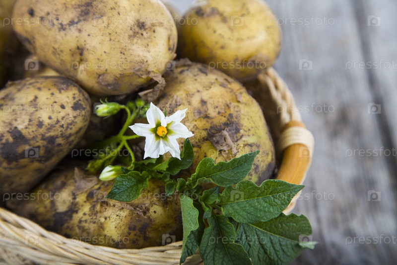 Сырой картофель с листьями на столе