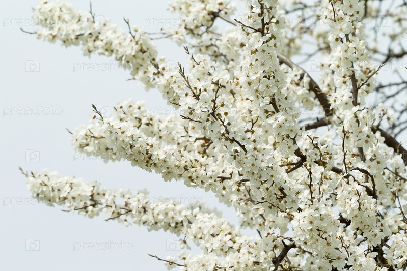 Ветки вишни в цвету на белом фоне