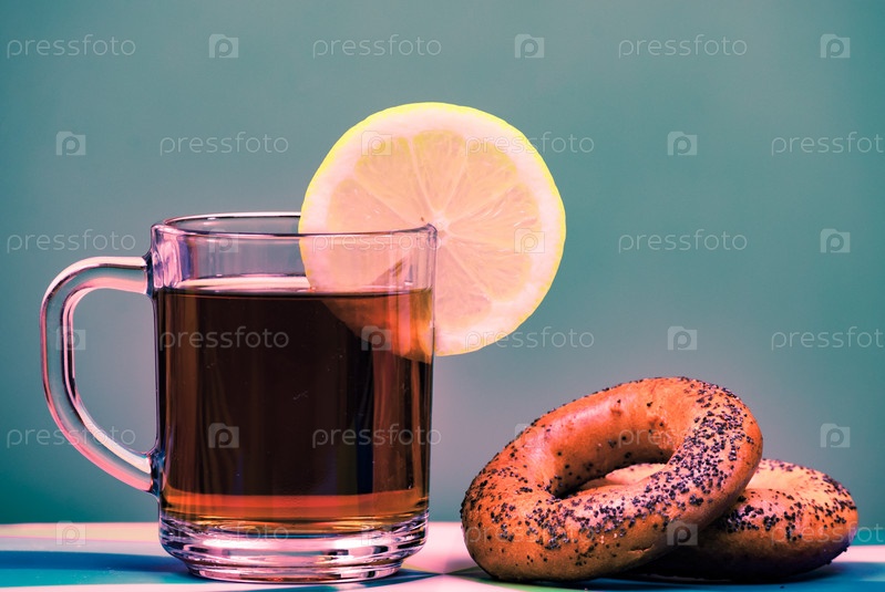 Чай в чашке с лимоном и бублики