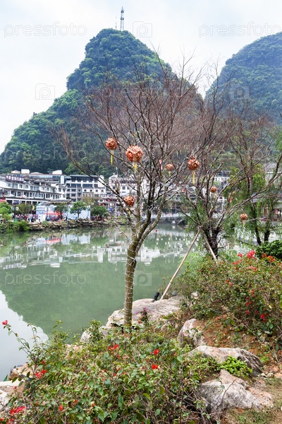 Дерево с фонариками на набережной в городе Яншо