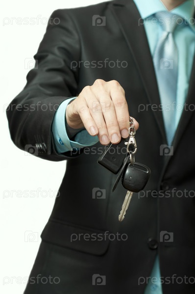 Предприниматель с ключом в руках на белом фоне