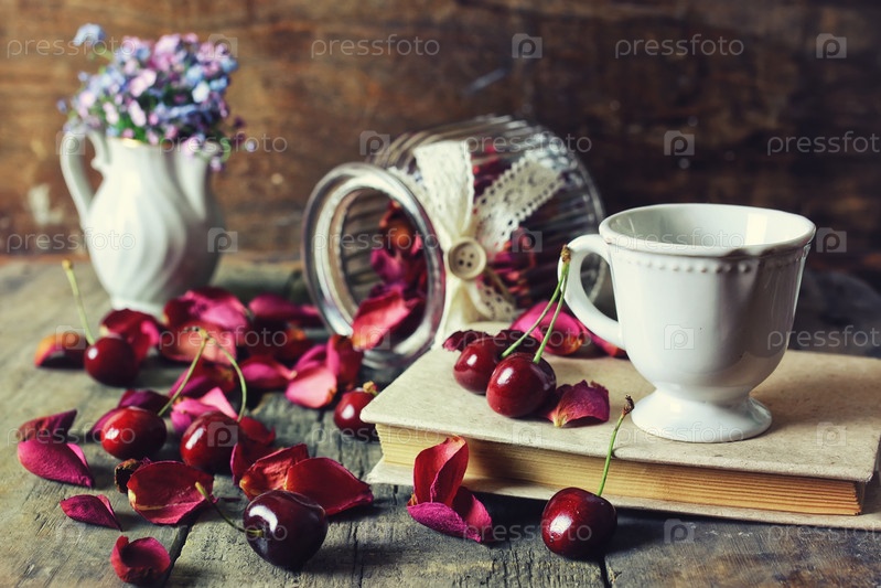 Вишня и лепестки роз