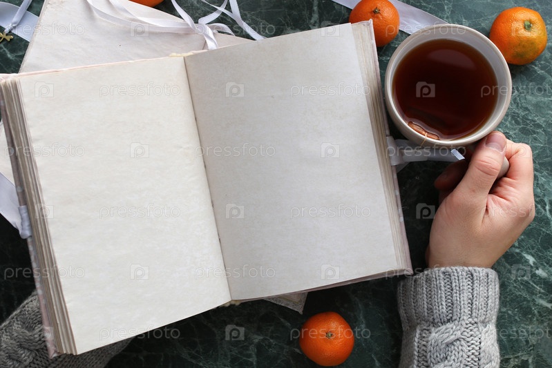 Ежедневник и чашечка чая в руке