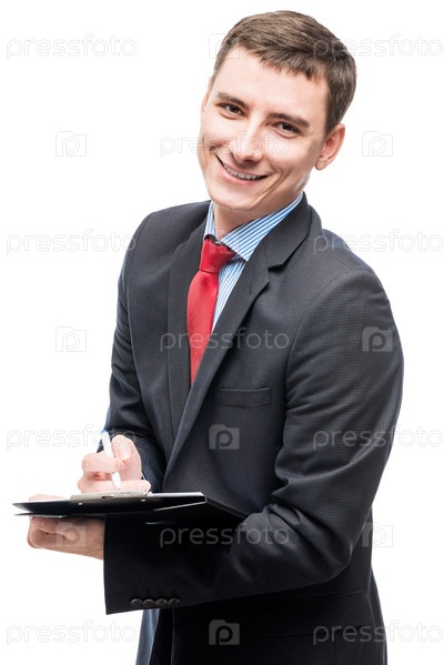 Бизнесмен в костюме с важными документами на белом фоне