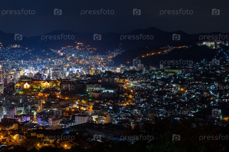 Город Нагасаки в Японии в ночное время