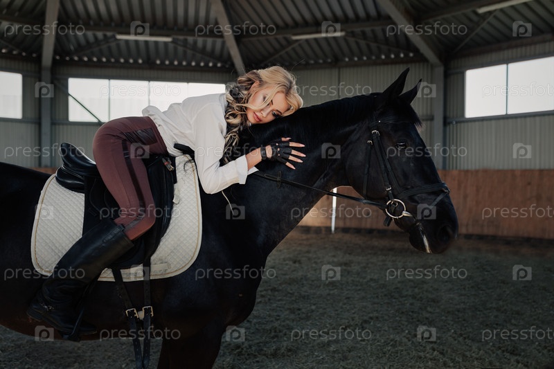 Красивая молодая блондинка лежит на своем черном коне