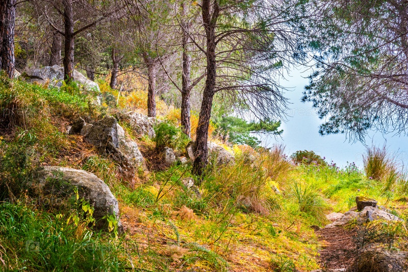 Пейзаж с деревьями и камнями