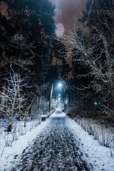 Деревья, покрытые снегом в зимнюю ночь