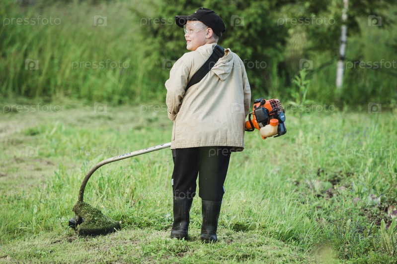 Мальчик скашивает траву