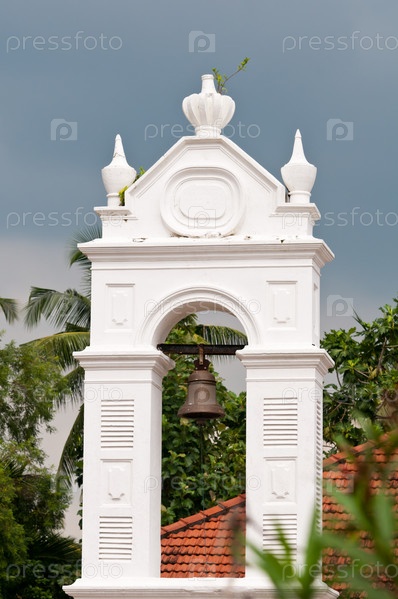 Старый церковный колокол в белой арке как пример колониальной архитектуры