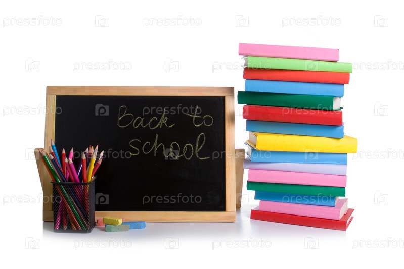 Школьная доска и цветные карандаши на белом фоне
