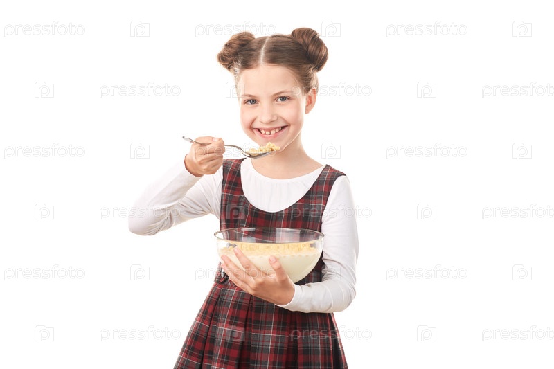 Девочка ест хлопья с молоком