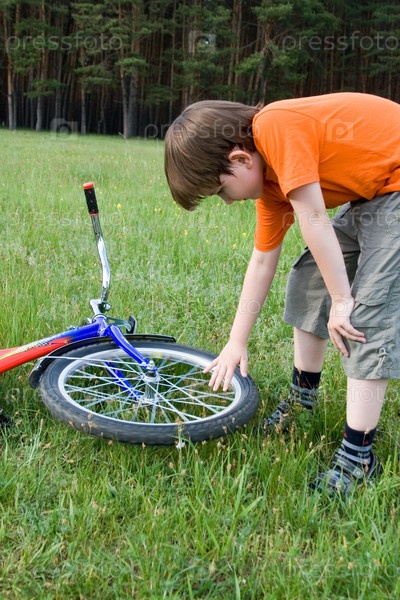 Мальчик с велосипедом на природе весной