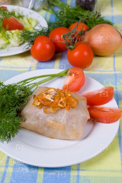 Голубцы и свежие овощи на столе
