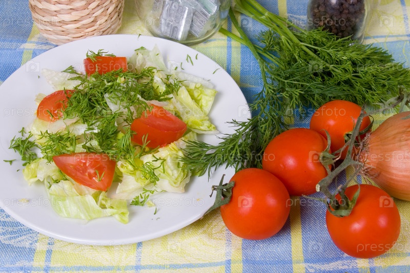 Овощной салат на клетчатой скатерти на столе