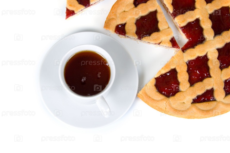 Ягодный пирог и чашка чая на белом фоне