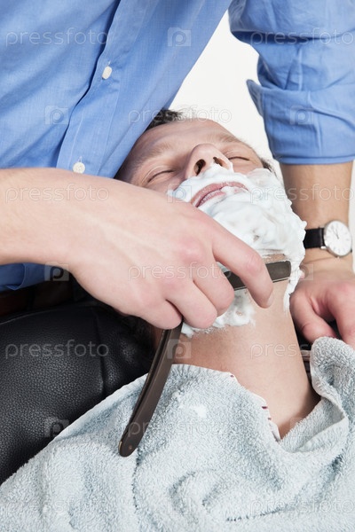Мужчина бреет опасной бритвой мужчину, сидящего в кресле