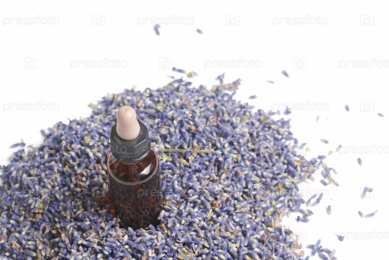 Сухие цветы лаванды и флакон из темного стекла с пипеткой