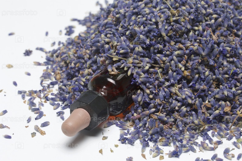 Сухие цветы лаванды и флакон из темного стекла с пипеткой