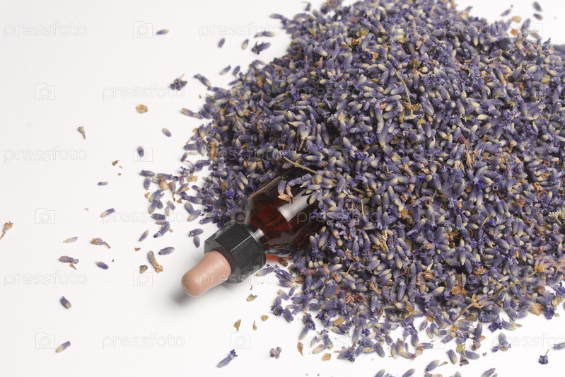 Сухие цветы лаванды и флакон из темного стекла с пипеткой