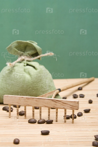 Зеленый мешочек, маленькие грабли и кофейные зерна