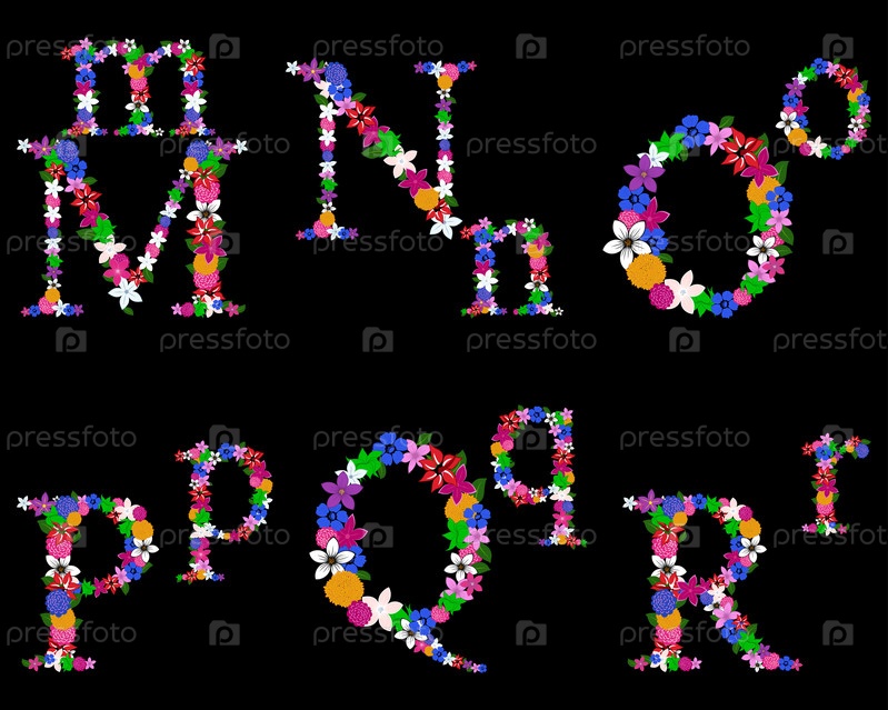 Алфавит из цветов на черном фоне для использования в веб-печати и дизайне. векторная иллюстрация
