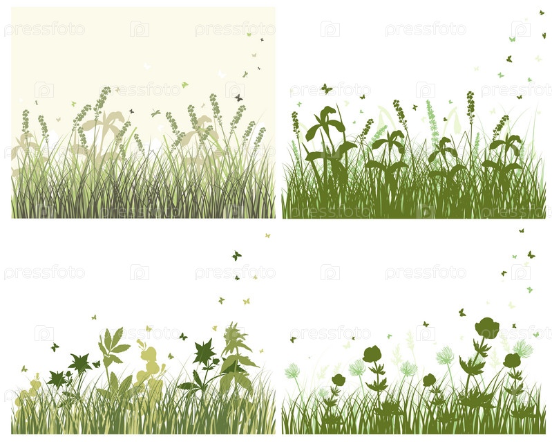 Трава и цветы с бабочками на белом фоне. Векторные иллюстрации