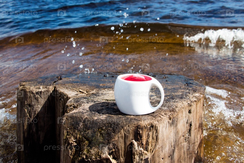 Чашка горячего чая ранним утром на берегу озера